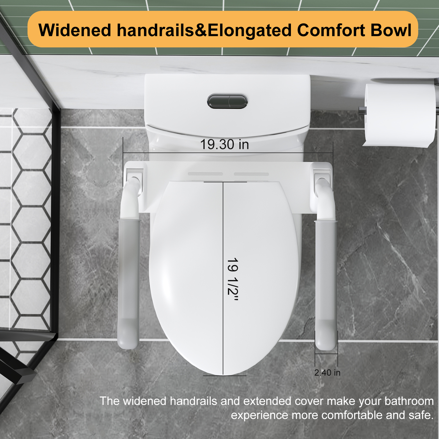 Wider anti-slip handrails: The widened ABS anti-slip handrails (2.4 inches) provide secure support and balance. Combined with the slender comfortable bowl, this design maximizes the safety of transfers and sitting positions.