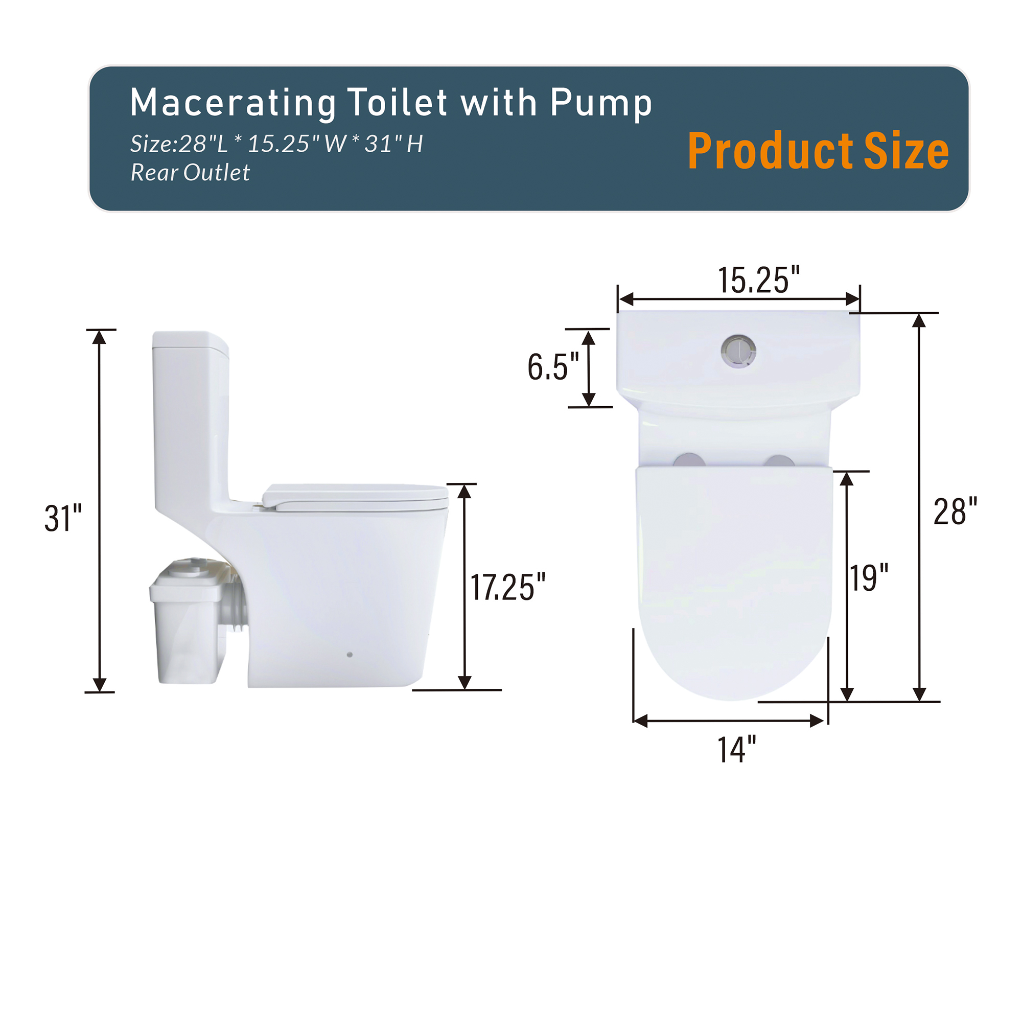 Modern high-performance 600W grinding pump toilet: The grinding pump uses an efficient 600W motor, featuring a horizontal drainage distance of up to 262 feet and a vertical drainage distance of 30 feet. The pump can effortlessly and quickly overcome the force of gravity to discharge wastewater, efficiently removing waste from toilets, sinks, commodes, showers, kitchen sinks, dishwashers, and washing machines. It is an ideal solution for basement or low-floor areas.