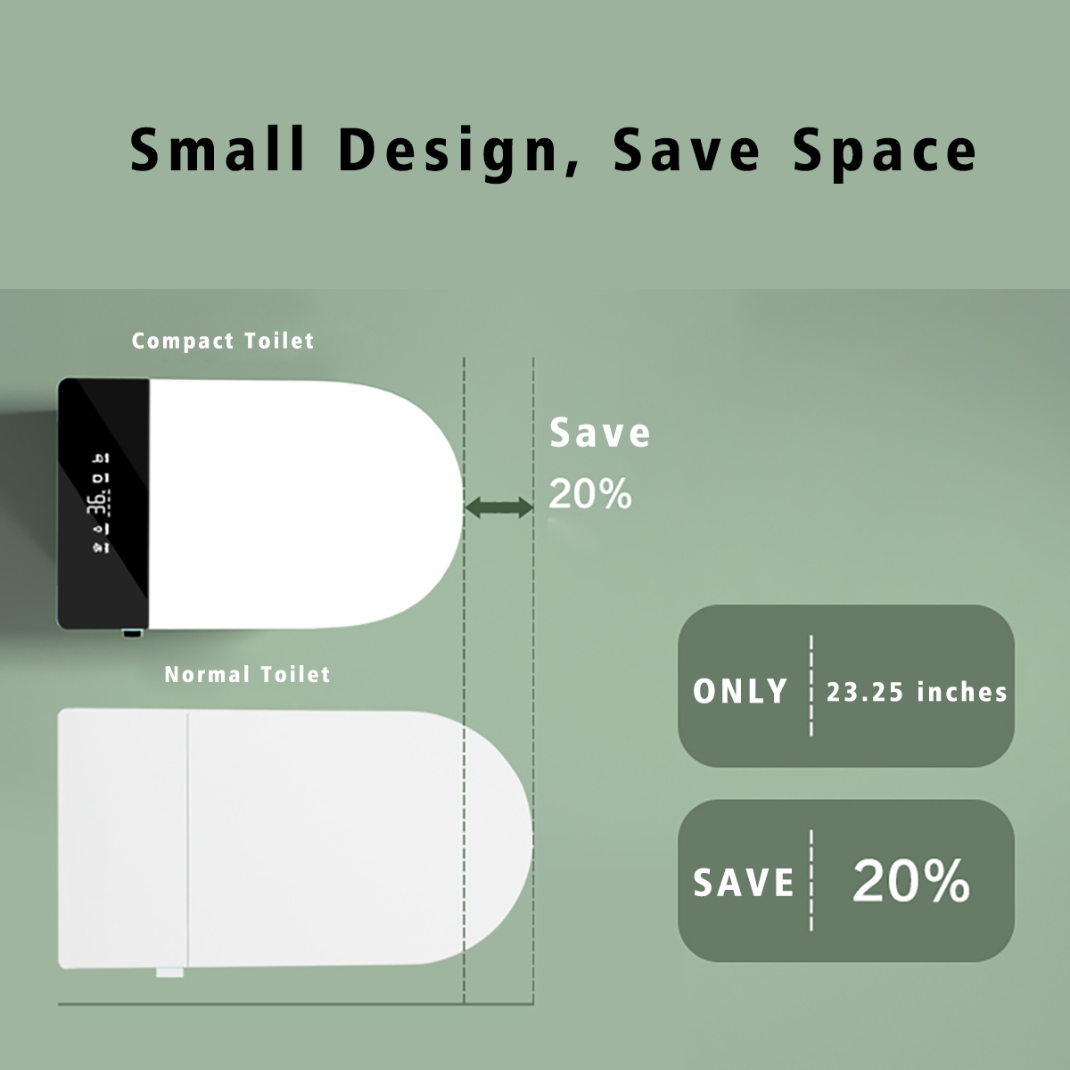 Compact design: This smart toilet measures only 23.25 x 15 x 18.5 inches and has a waterless tank design, making it suitable for small bathroom spaces.