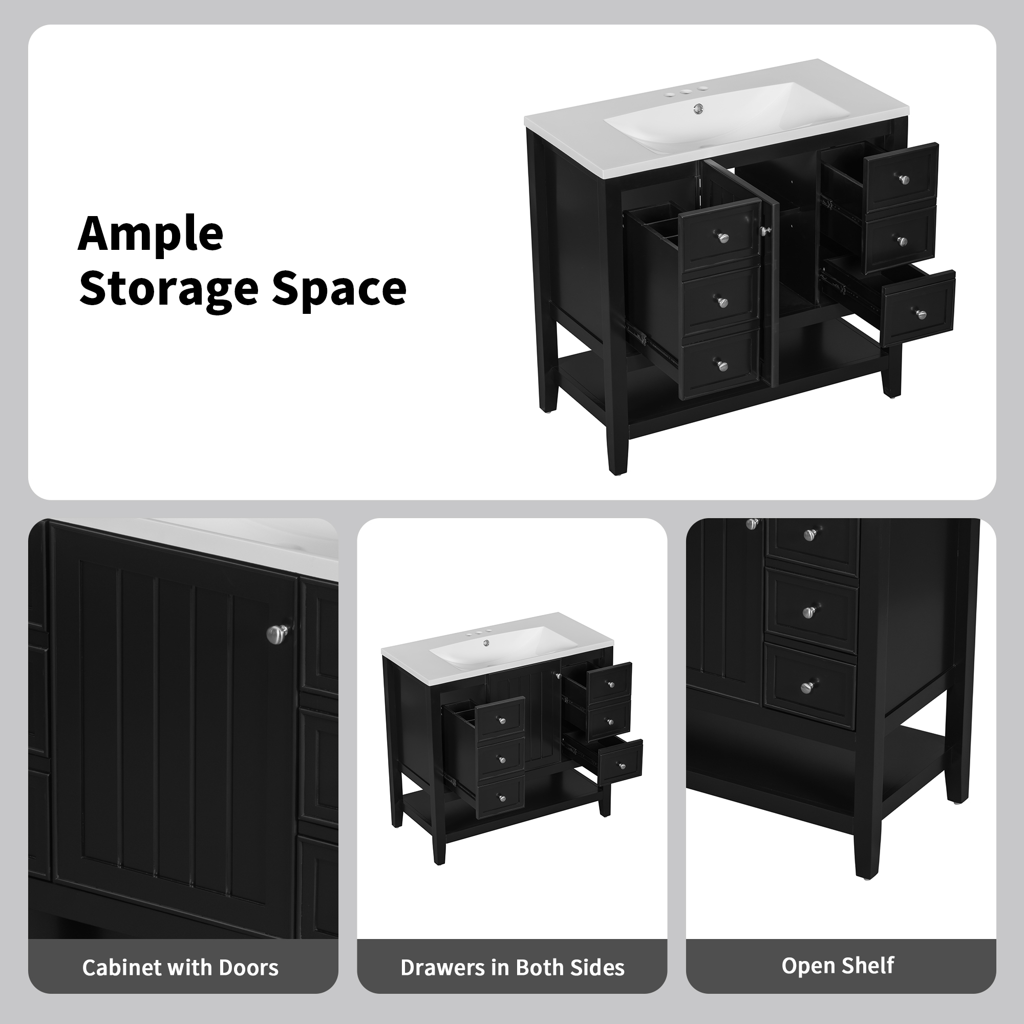 Open convenience shelves: The bottom of the cabinet is designed with open shelves, which is convenient for storing items like soap and shampoo, making it easier to reach and retrieve.