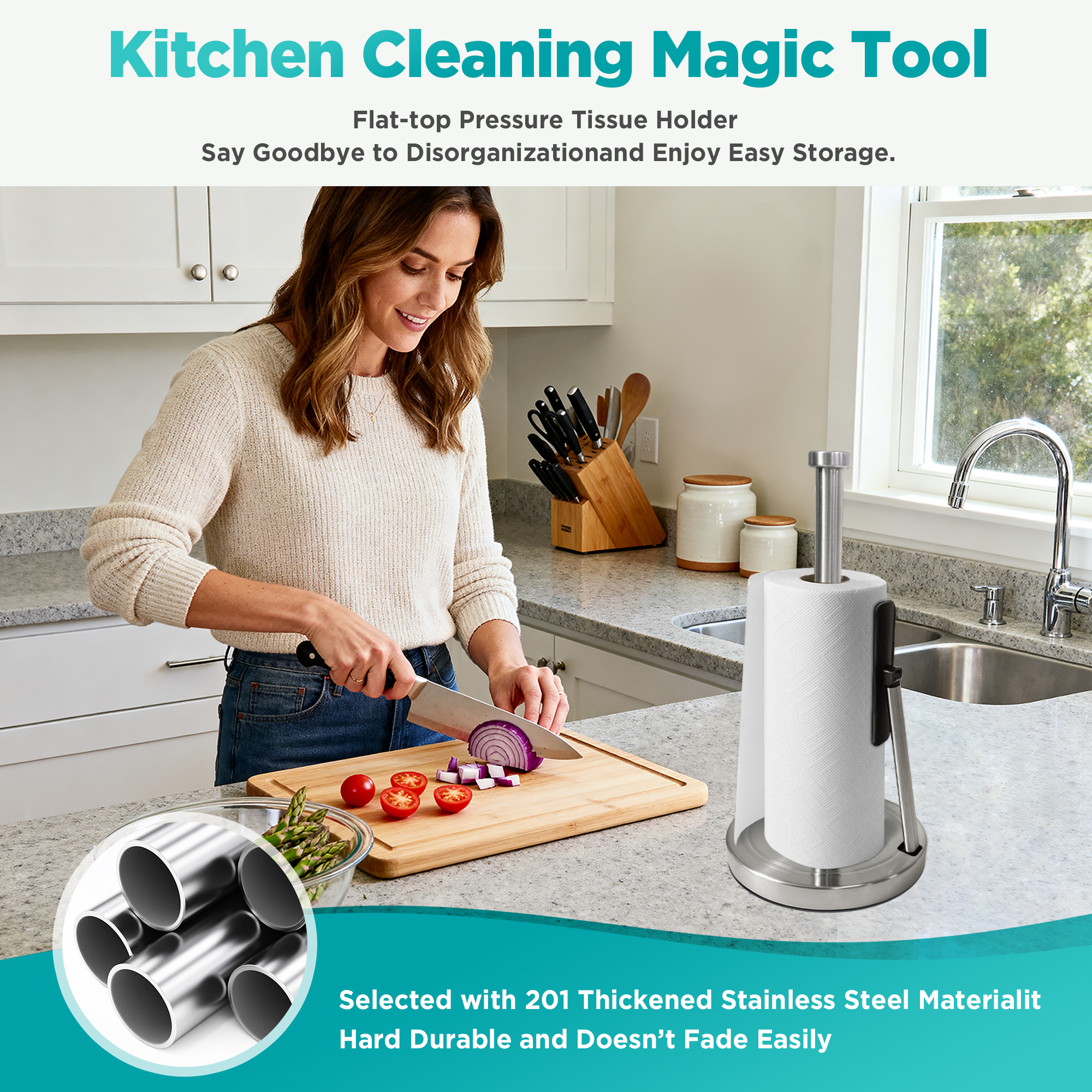 Let this premium paper towel holder simplify your kitchen routine. It enables you to effortlessly tear one or multiple paper towel sheets with just one hand, making cleanup tasks a breeze. The integrated finger loop allows for quick and easy relocation whenever needed. The weighted base, combined with an EVA anti-slip pad at the bottom, ensures the holder stays firmly in place during use. The arc-shaped top prevents finger scratches, and the pressure bar ensures smooth and precise tearing every time.
