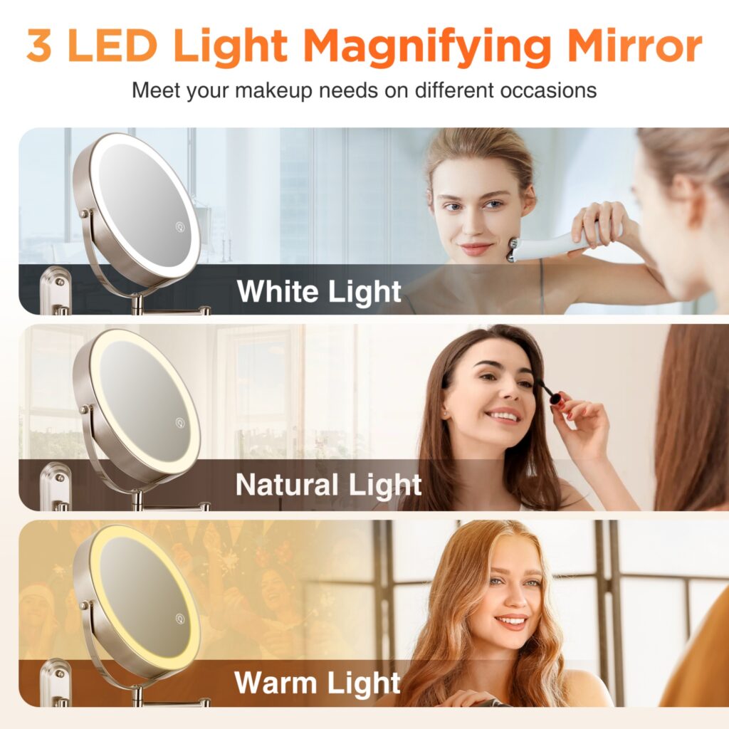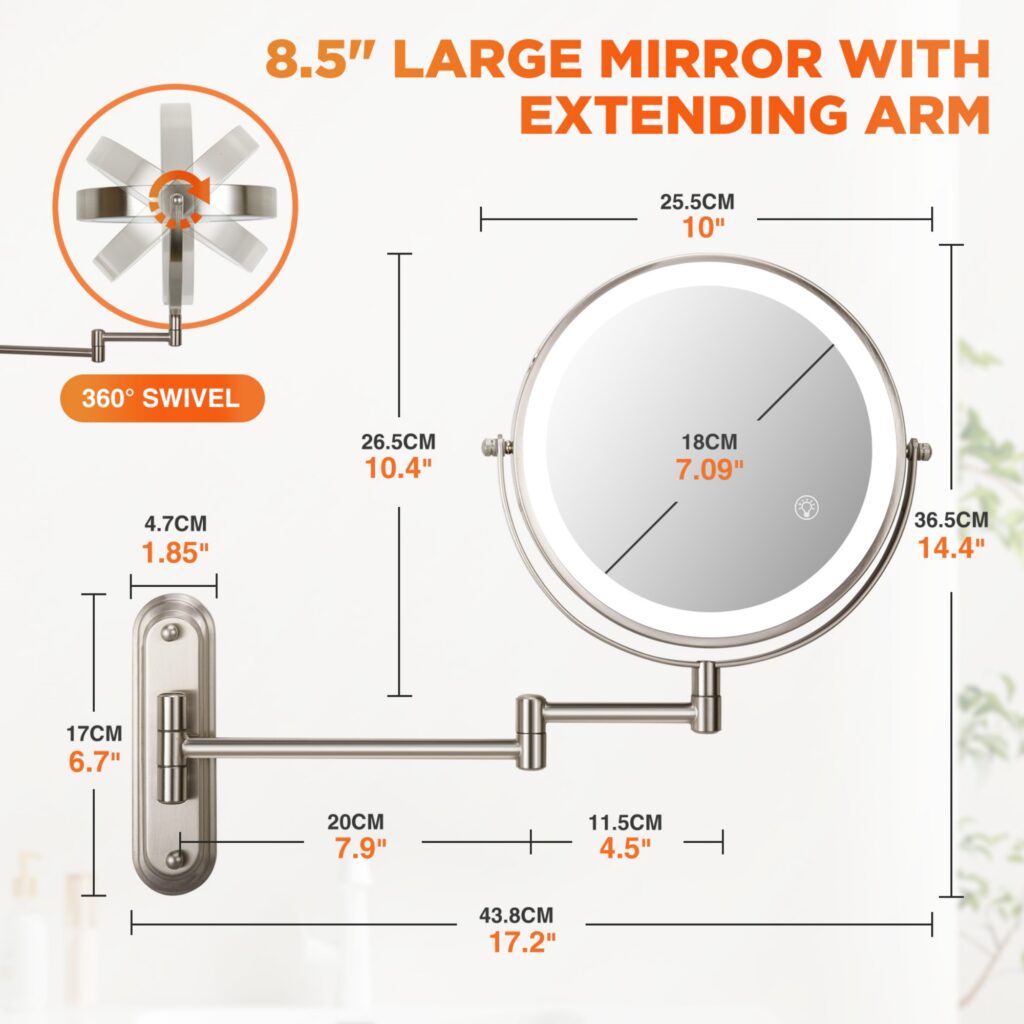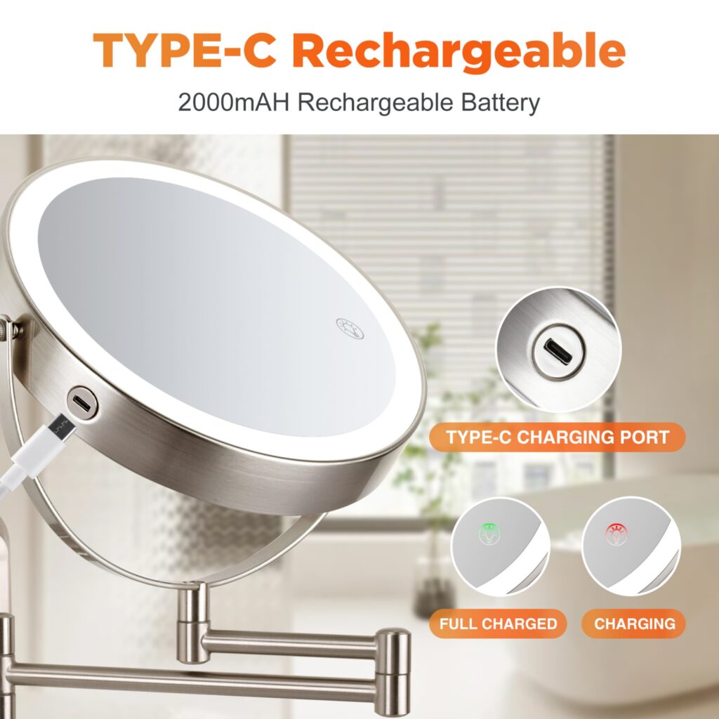 This wall-mounted makeup mirror is a perfect blend of functionality and style. It features a long, narrow base that not only saves space but also adds a modern touch to your bathroom or dressing area. The mirror is equipped with 3-LED light modes-White Light, Natural Light, and Warm Light, allowing you to adjust the lighting according to different occasions and makeup needs. With a 360掳 swivel and an extending arm, you can easily position the mirror at your desired angle and distance. The 8.5 in. large mirror provides a clear and detailed reflection, and the brightness can be adjusted with a long touch, ranging from 0-LUX to 2000-LUX. It also comes with a Type-C rechargeable 2000mAh battery, ensuring long-lasting use without the hassle of frequent charging. The mirror is composed of 60-LED beads and reflective paper, providing ample and even lighting for your makeup routine.