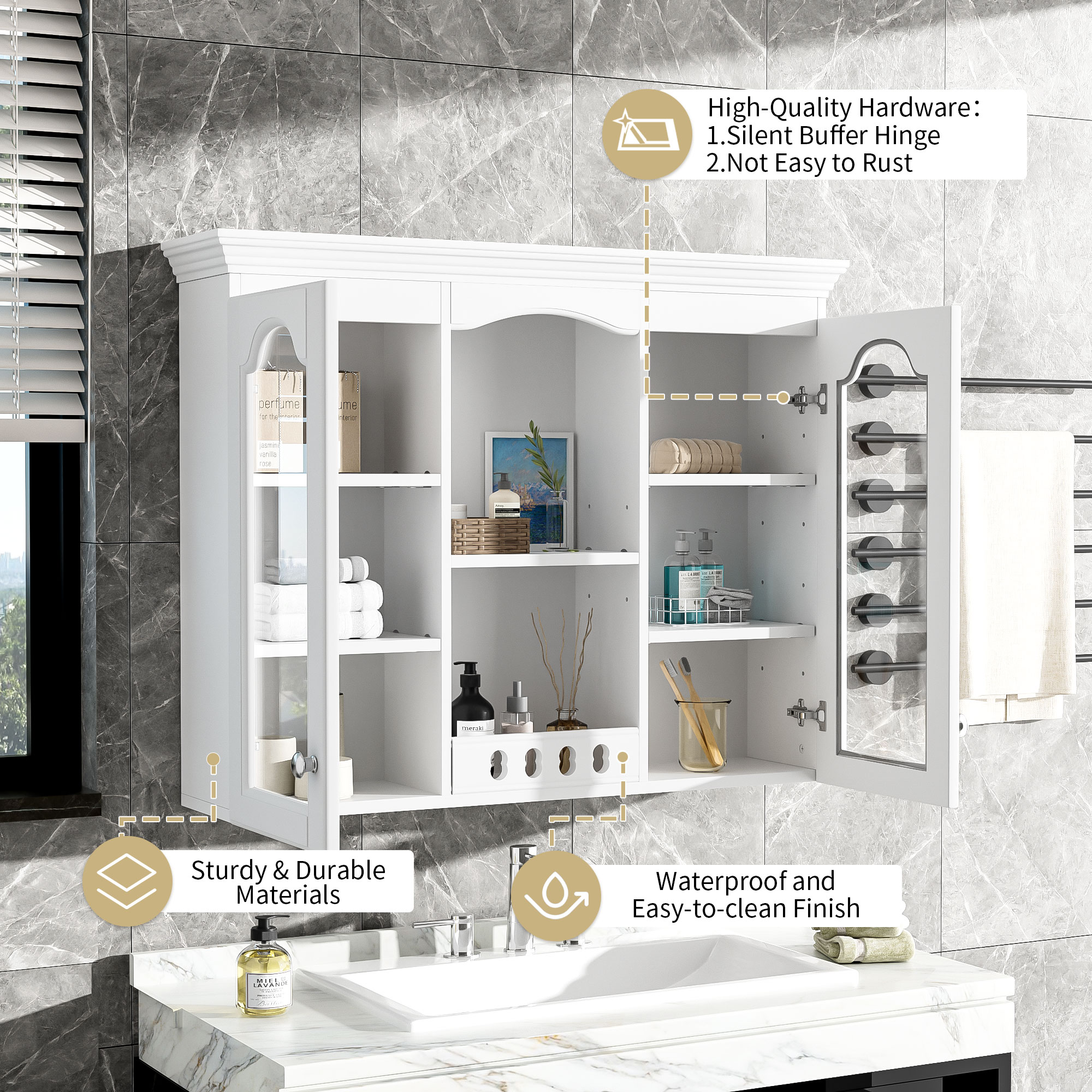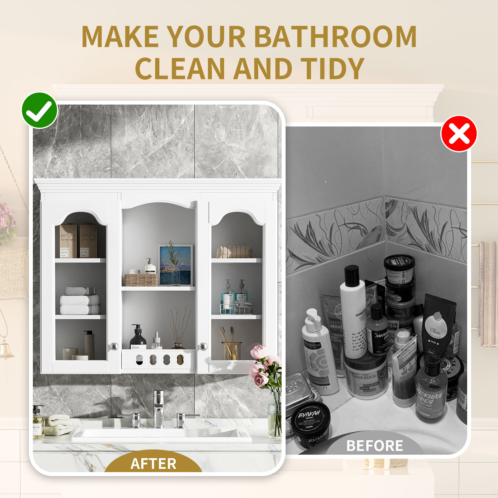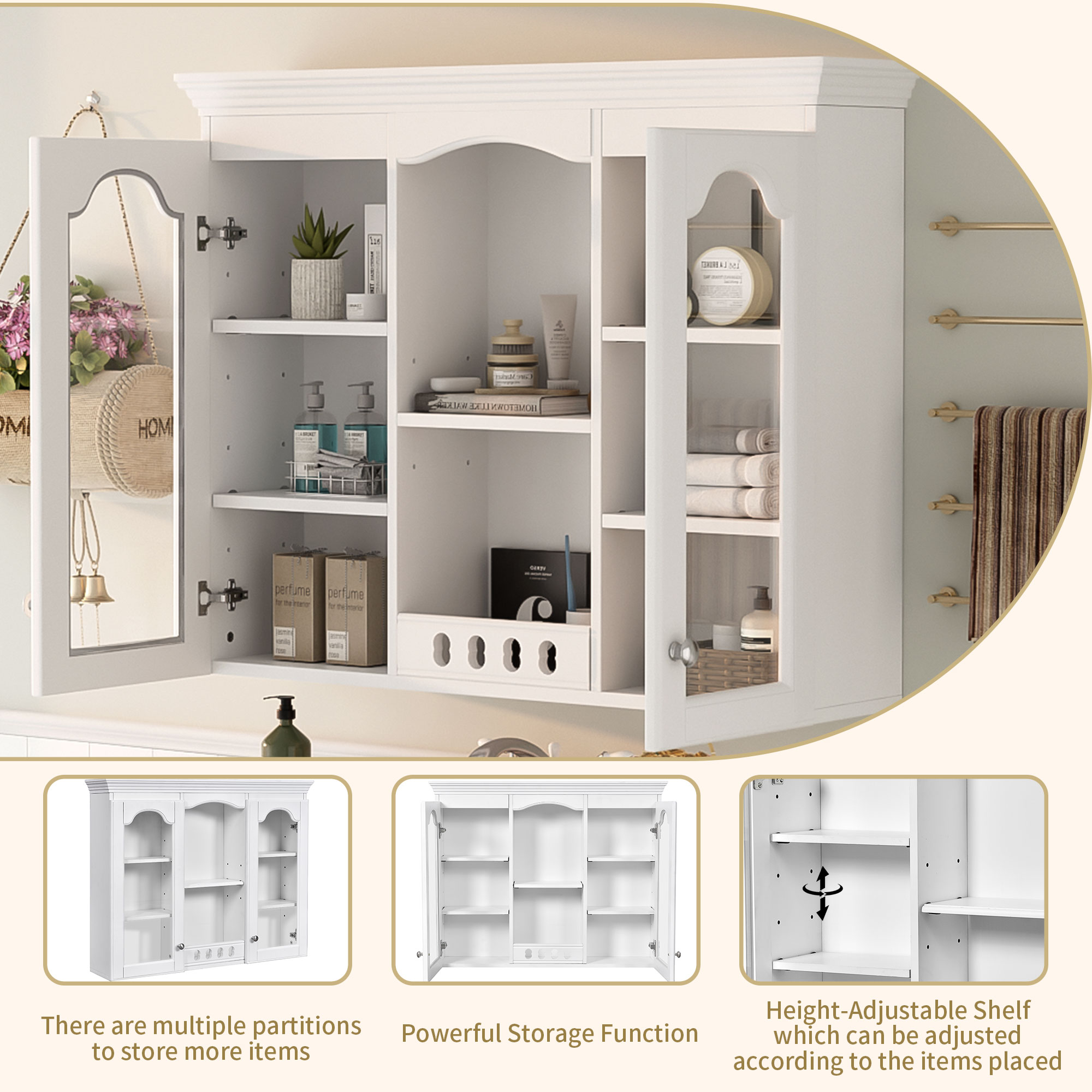 This wall-mounted bathroom mirror cabinet features a space-saving design, which can be securely installed on the wall or above the toilet. It provides an efficient storage solution for bathrooms, bedrooms, or living rooms, without occupying floor space. The cabinet is equipped with height-adjustable shelves that can be flexibly adjusted within a range of 2.5 inches, easily accommodating various heights of toiletries, wash products, and medicines. The cabinet body is made of high-quality medium-density fiberboard and is treated with waterproof and moisture-proof paint, providing long-lasting protection against damp environments, making it durable and safe. The design is simple and elegant, with clean lines, and can naturally blend into various home styles, enhancing the visual experience of the space. Installation is straightforward, and the packaging includes all accessories and diagrams for assembly. After assembly, the dimensions are 35.27 inches wide x 28 inches high x 7.83 inches deep, and the shipping packaging size is 40 inches x 19 inches x 9 inches.