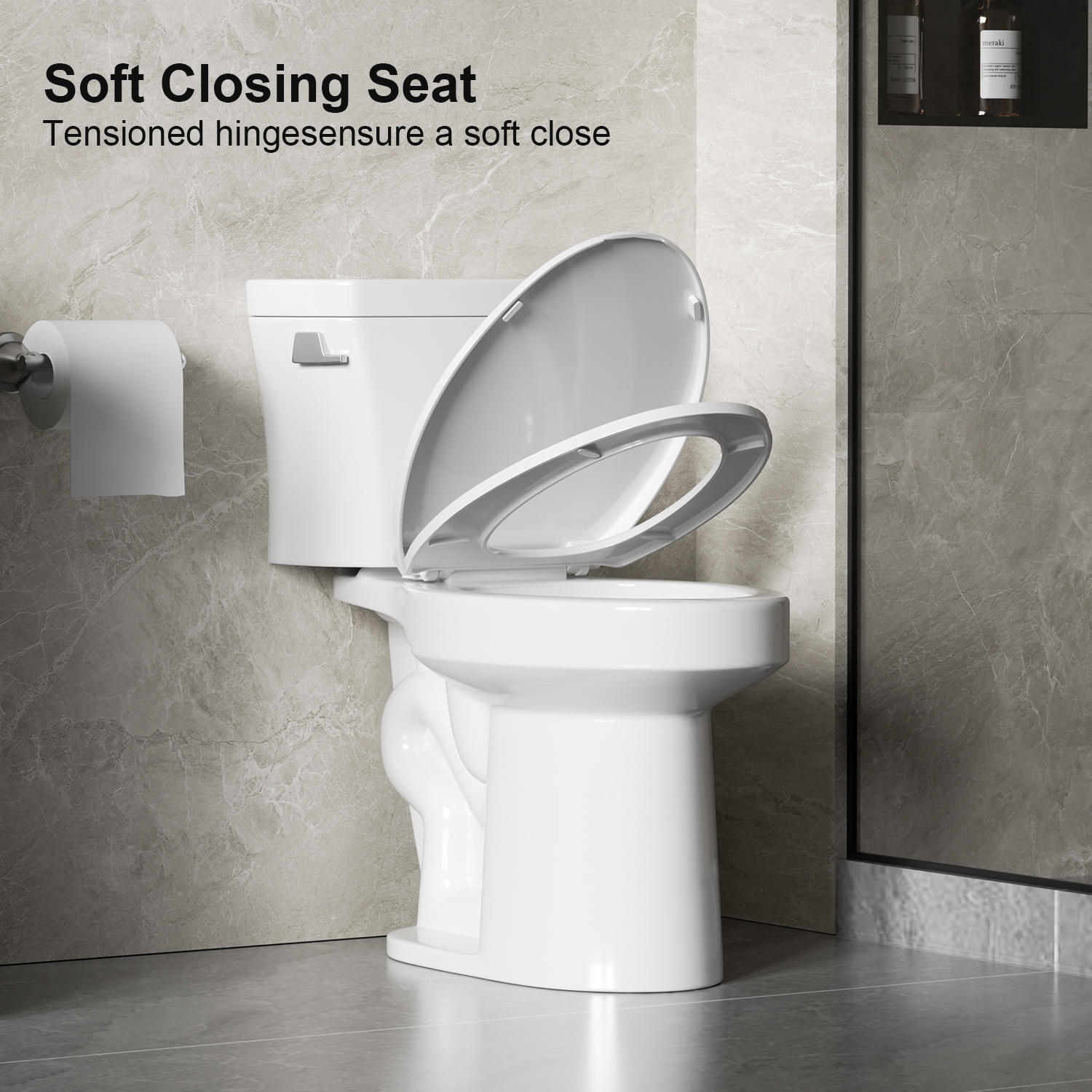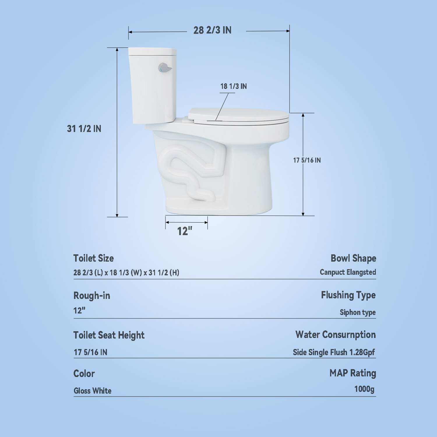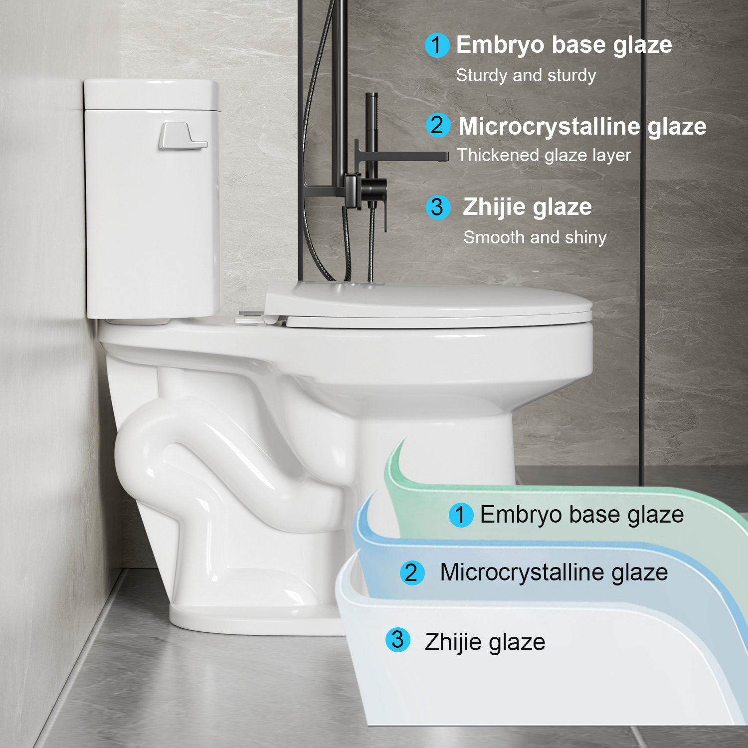 This two-piece design toilet combines a long and comfortable seat with an optimized ergonomic height, providing an exceptionally spacious experience and making getting up and sitting easier and less strenuous. It strikes a balance between efficient water conservation and powerful performance, requiring only 1.28 gallons of water per flush. The sleek and stylish polished chrome flushing handle on the left enhances the overall texture, while the embedded water tank liner effectively prevents condensation problems in humid environments. Its core is a single-flush gravity flushing system, utilizing precise engineering and natural gravity to form a powerful siphon effect, ensuring thorough cleaning each time. The unique 360° vortex flushing technology causes the water to swirl around the entire inner wall, providing a comprehensive cleaning and effectively eliminating residue, ensuring long-lasting cleanliness. This toilet set, designed for durability and reliability, features a standard 12-inch Rough-in and can easily fit into most bathroom spaces, making it a wise choice for those seeking a comfortable, efficient, and long-lasting cleaning experience.