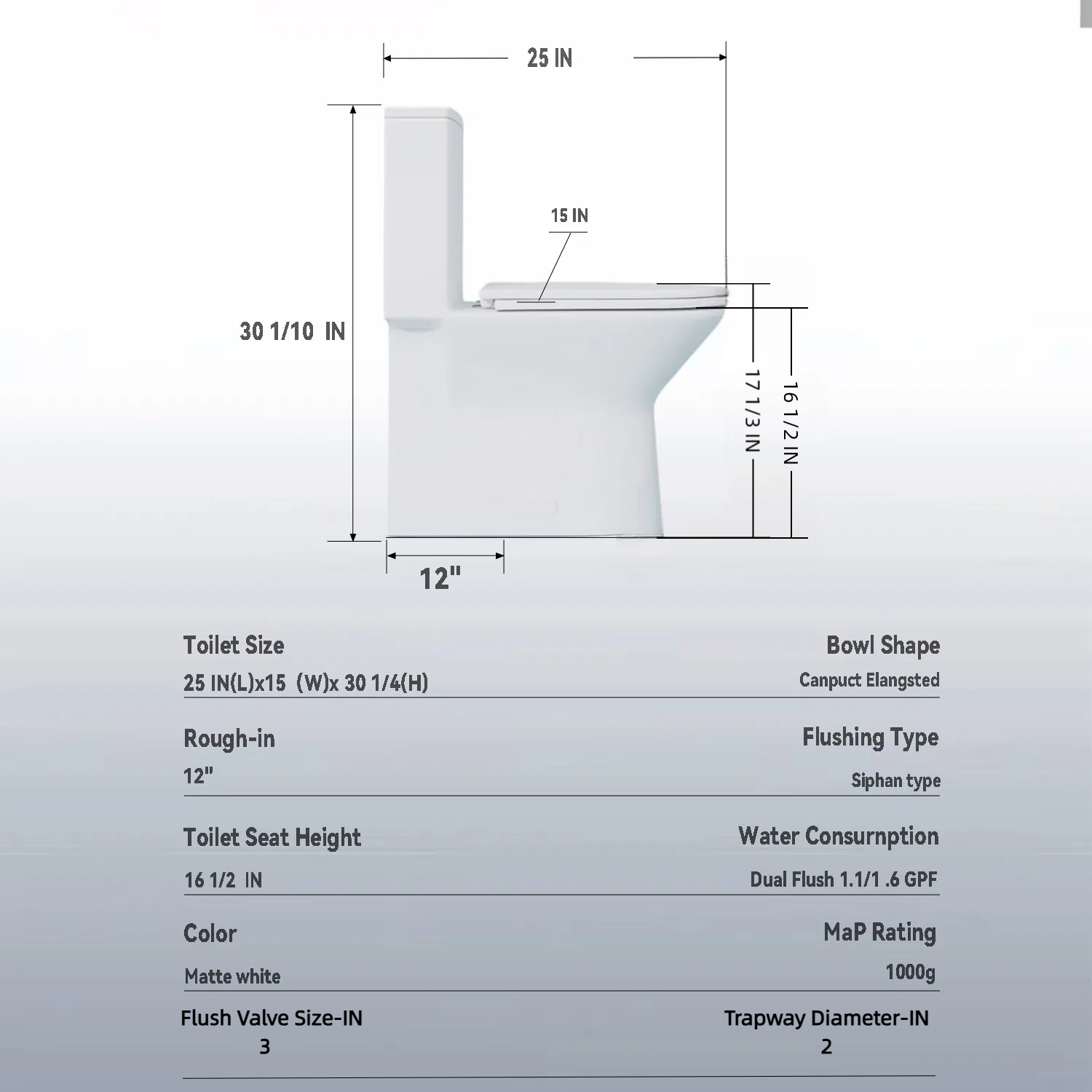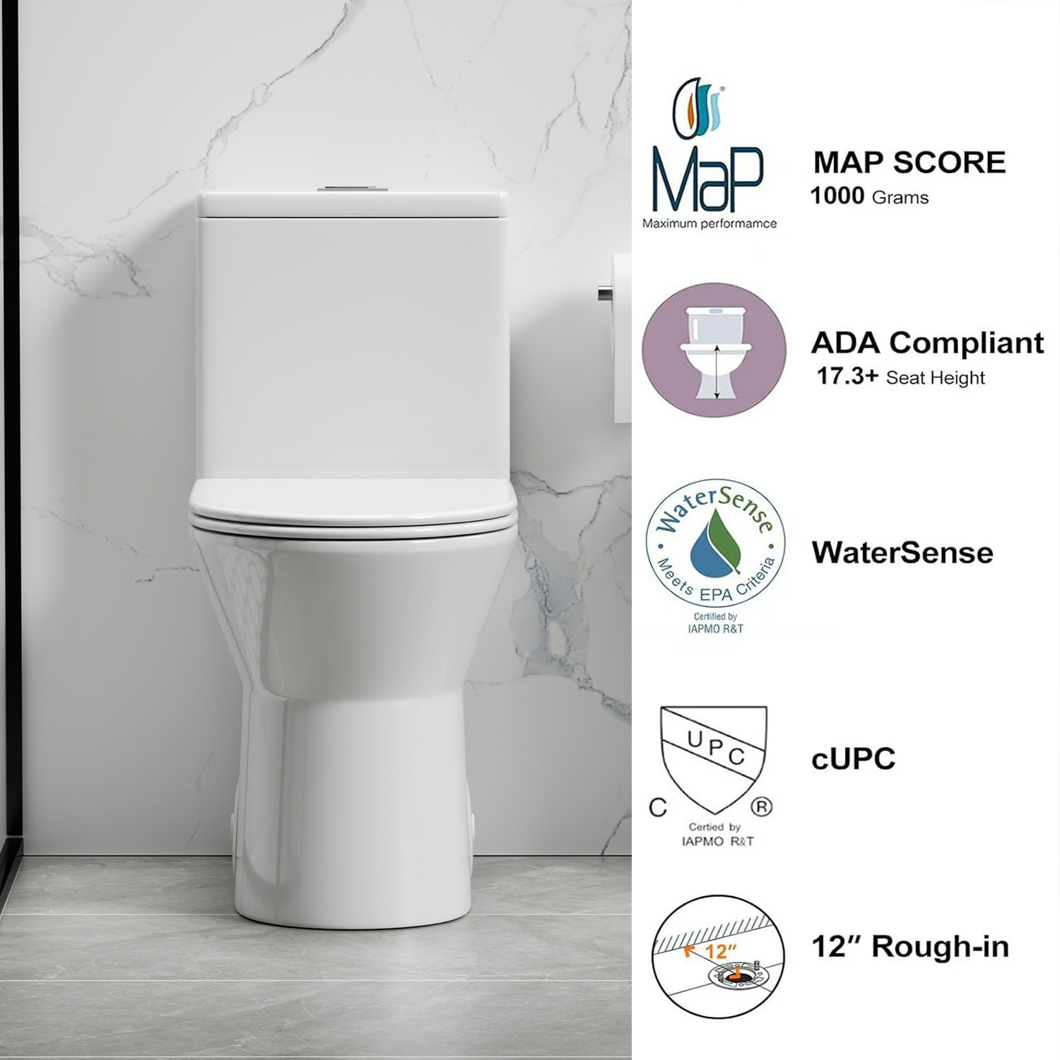 This toilet has received certifications from WaterSense®, CUPC and CEC, demonstrating its commitment to water efficiency, safety and sustainability. Moreover, its impressive 1000-gram MAP score highlights its outstanding waste removal capabilities, ensuring reliable performance.